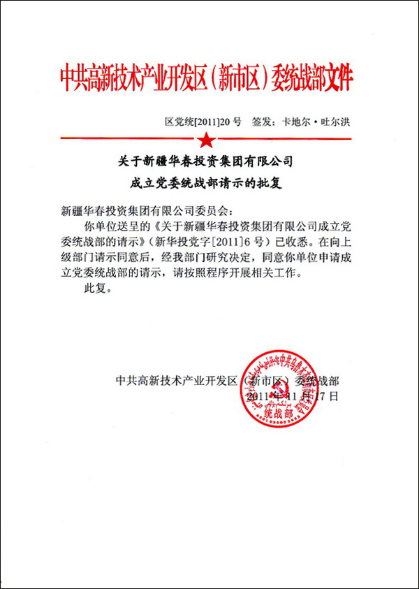 11月17日下午,新疆華春投資集團黨委書記嚴天利,懷著激動的心情從高新區(新市區)委統戰部接過批復,同意華春集團成立黨委統戰部,請按照秩序開展相關工作,至此,標志著非公有制企業統戰工作全面開始。